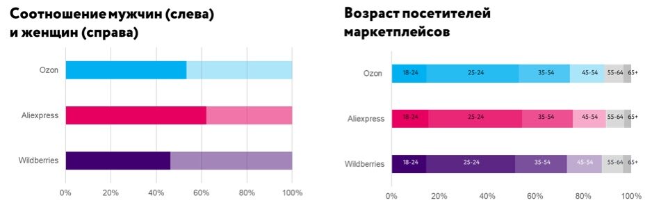 Перевес, хоть и незначительный, в сторону мужской аудитории наблюдается у Ozon и Aliexpress.