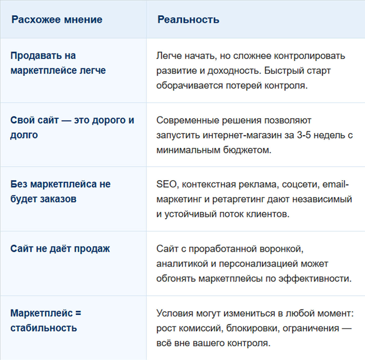 Комиссии на маркетплейсе — это чёрный ящик. Сегодня 25%, завтра 35%, послезавтра — ещё и плата за «выделенное размещение». А на собственном сайте вы видите точную структуру затрат и сами решаете, во что инвестировать.