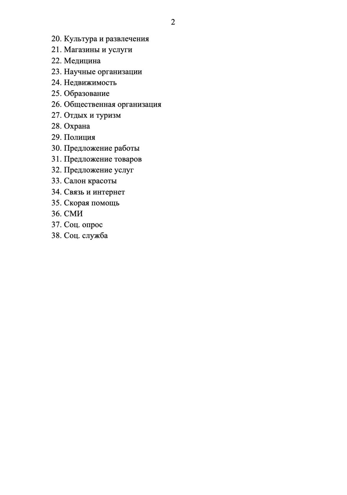 Аварийная служба, Автосервис и техобслуживание, Аренда и прокат, Банк, Визовый центр, Госорганизация, Гостиницы, Доставка, Досуг, Еда, Завод и предприятие, Заказ такси, Инвестиции, Кафе и рестораны, Клининг, Коллекторы, Коммунальные услуги, Консультирование и аудит, Кредиты, Культура и развлечения, Магазины и услуги, Медицина, Научные организации, Недвижимость, Образование, Общественная организация, Отдых и туризм, Охрана, Полиция, Предложение работы, Предложение товаров, Предложение услуг, Салон красоты, Связь и интернет, Скорая помощь, СМИ, Соц. опрос, Соц. служба.