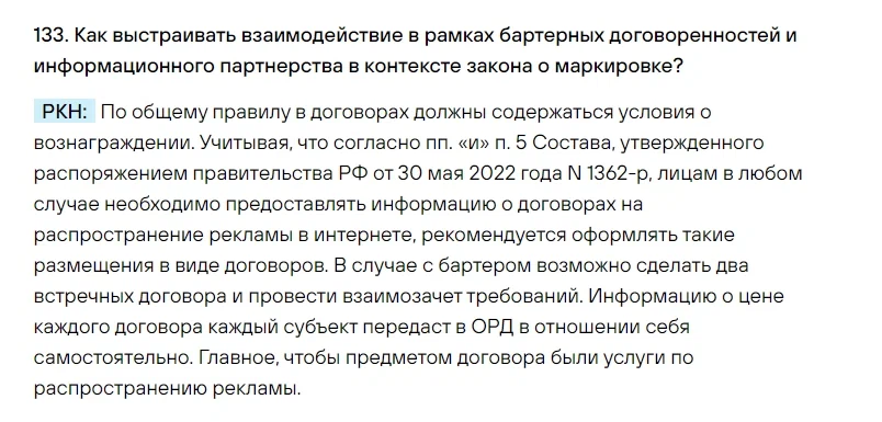 Маркировка рекламы по бартеру либо взаимопиару с отчетами в ОРД