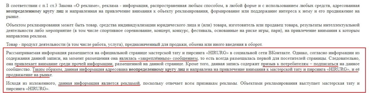 Например, буквально на днях ФАС признал рекламой закрепленный пост в сообществе Тату-студии. Заявитель обвинил группу в нарушении закона «О рекламе».