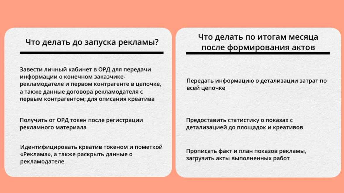 Перед запуском рекламной кампании необходимо получить у оператора рекламных данных специальный токен. Для этого компания должна предоставить оператору информацию о себе, такую как ИНН, название компании, ФИО руководителя, ОГРН или ОГРНИП, местонахождение и данные о договорах с рекламной системой.