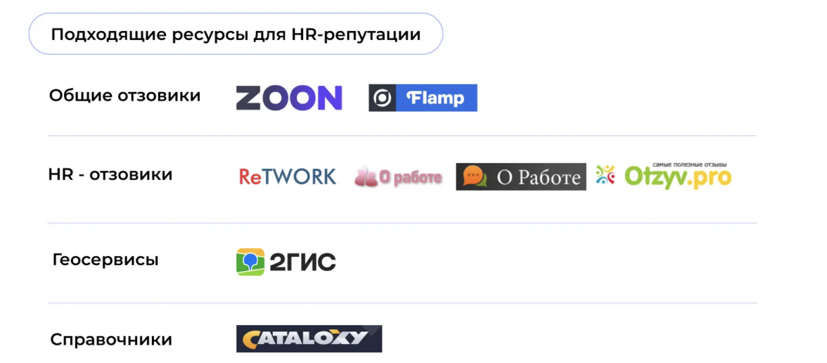 В проект вошли 15 площадок: крупные отзовики, специализированные порталы о работодателях и геосервисы. Такой набор помогает решить сразу две задачи. Во-первых, 15 ресурсов достаточно, чтобы сформировать положительный образ компании в топе поисковой выдачи. Во-вторых, так мы обеспечиваем разнообразие информации: например, на одной площадке обсуждают уровень заработной платы и условия, а на другой — расположение офиса и общее впечатление о работодателе.