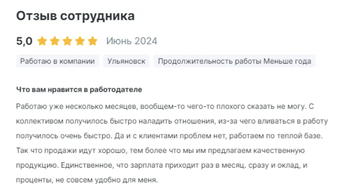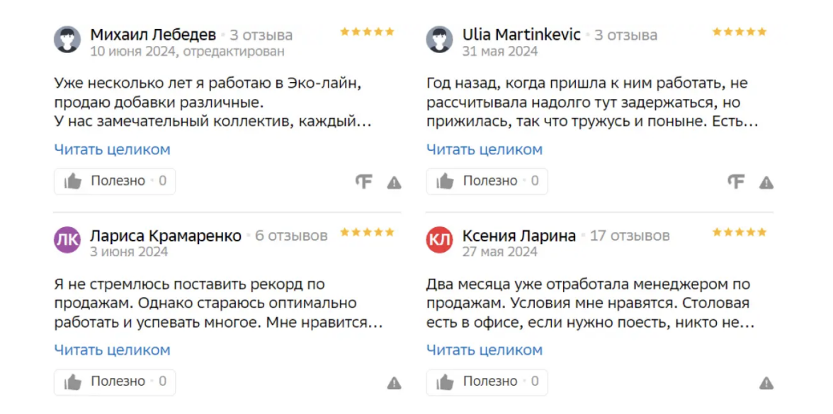 Всего за несколько месяцев нам удалось получить более 100 отзывов. Это серьёзная репутационная поддержка на будущее — даже если появятся негативные комментарии, общее впечатление о компании всё равно останется положительным. Живые отзывы сотрудников дают будущим кандидатам массу полезной информации: какая на этом рабочем месте зарплата, руководители, атмосфера в коллективе, условия труда, задачи и многое другое.