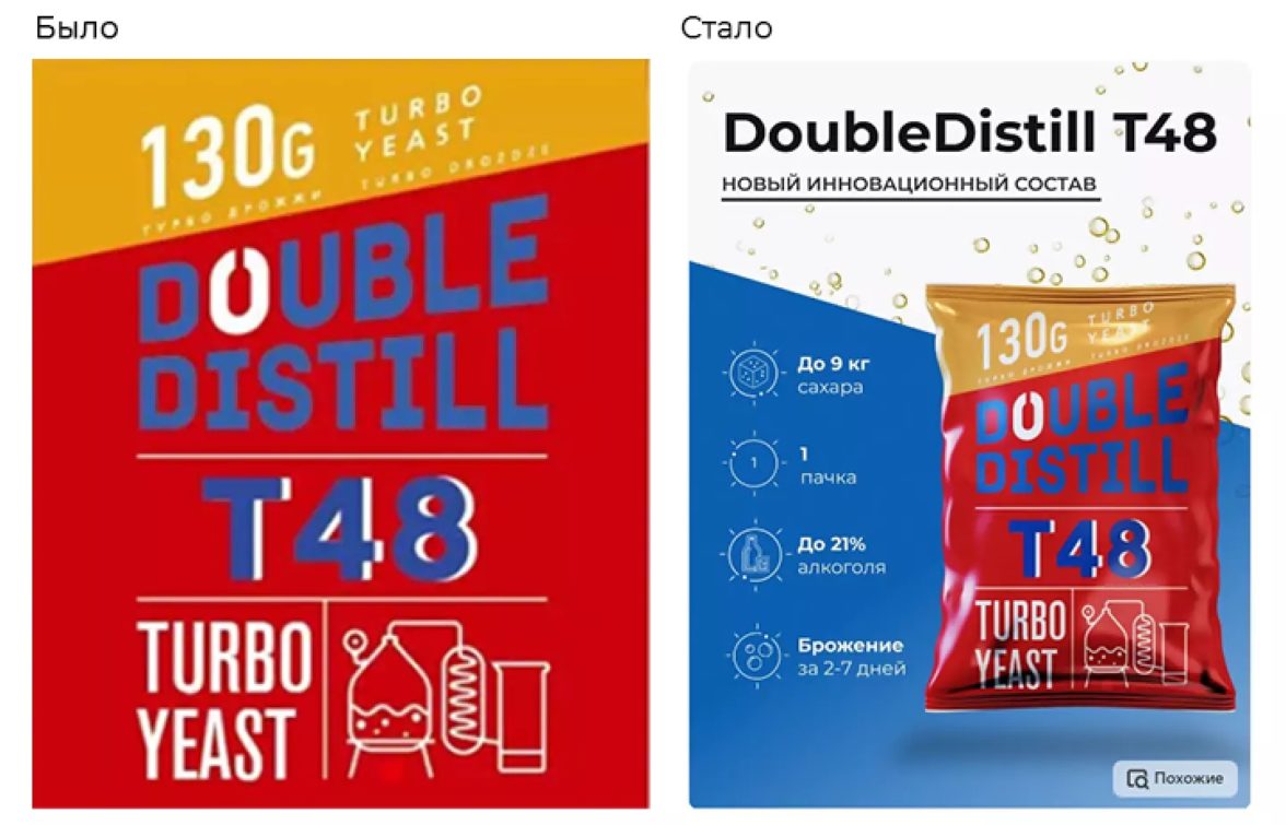 SEO-оптимизация товара не работала, так как в карточке не было никакого описания. Покупатели не видели товар в нужной категории. Поэтому и продажи стремились к нулю. Мы написали продающий текст о товаре, оптимизировали его ключевыми фразами. Внесли категории и характеристики в карточку. Спиртовые дрожжи Double Distill «вышли из сумрака», товар стал видимым для покупателей. Теперь его можно найти по ключевым запросам. Дрожжи появились в разделе «продукты/бакалея».