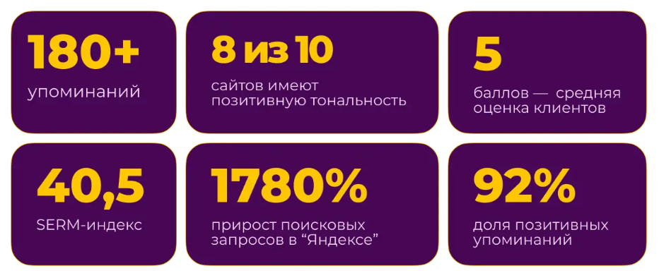 Количество упоминаний выросло с 0 до 181, при среднем приросте +45 сообщений в месяц. 92% всех упоминаний — позитивные, остальные нейтральные. Подтверждённого негатива не выявлено. Средняя оценка на отзовиках — 5,0 баллов. В поисковой выдаче Яндекса 8 из 10 позиций заняли позитивные площадки. Количество запросов в Wordstat увеличилось на 1780%. SERM-индекс поднялся с –2 до 40,5 пунктов.