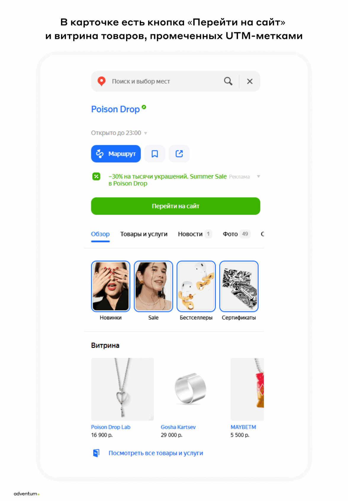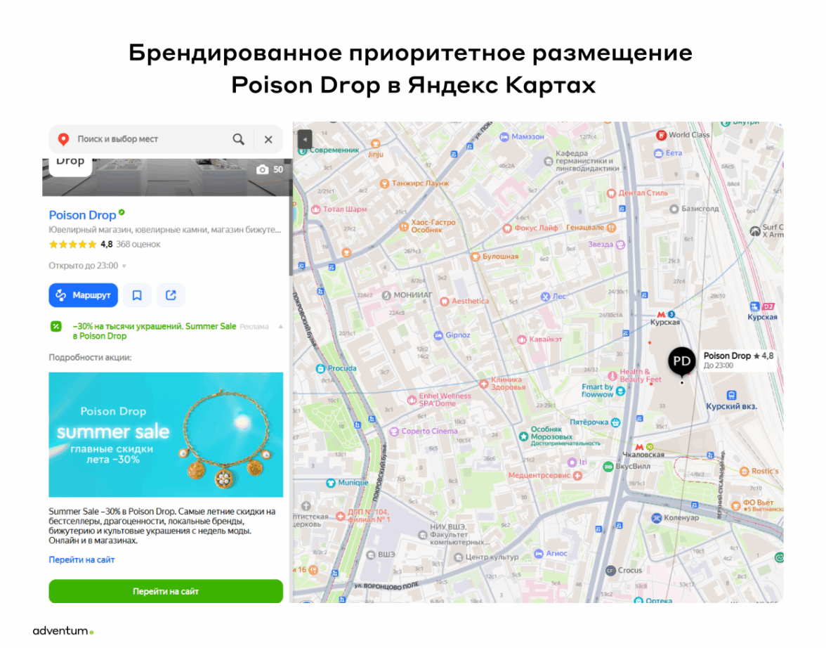 В 2023 году команда ювелирного бренда Poison Drop обратилась в Adventum с запросом на размещение в Яндекс Картах. Это должно было помочь бренду: