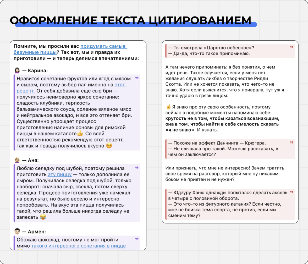 Использование цитирования при оформлении постов в каналах позволяет сделать акценты на определённых частях текста, особенно это актуально при больших объемах копирайта.