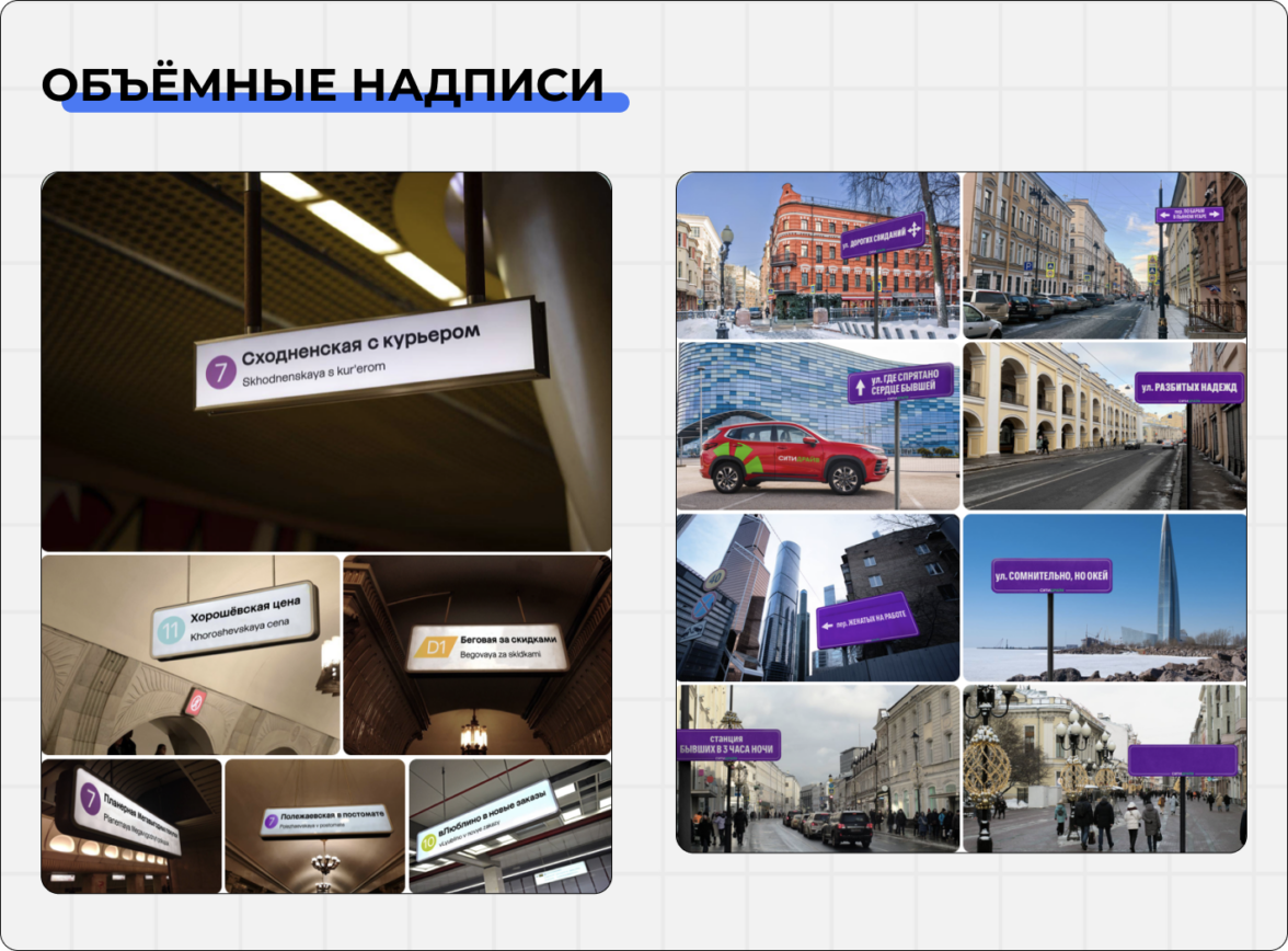 Классный формат для подачи разной информации (например, ключевых бенефитов, на примере «Мегамаркета») в развлекательном формате через названия улиц или станций метро.