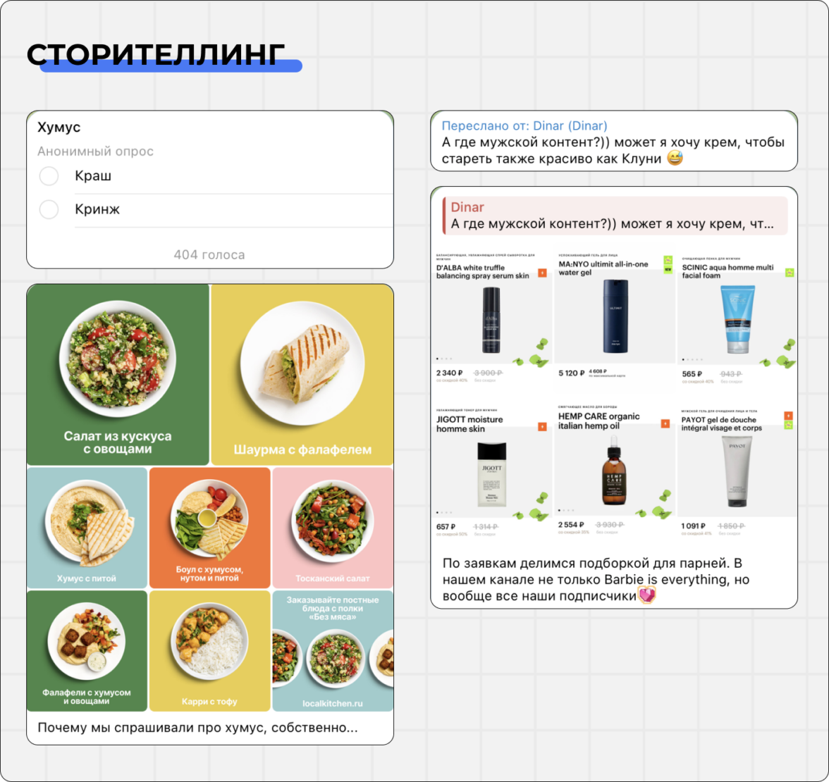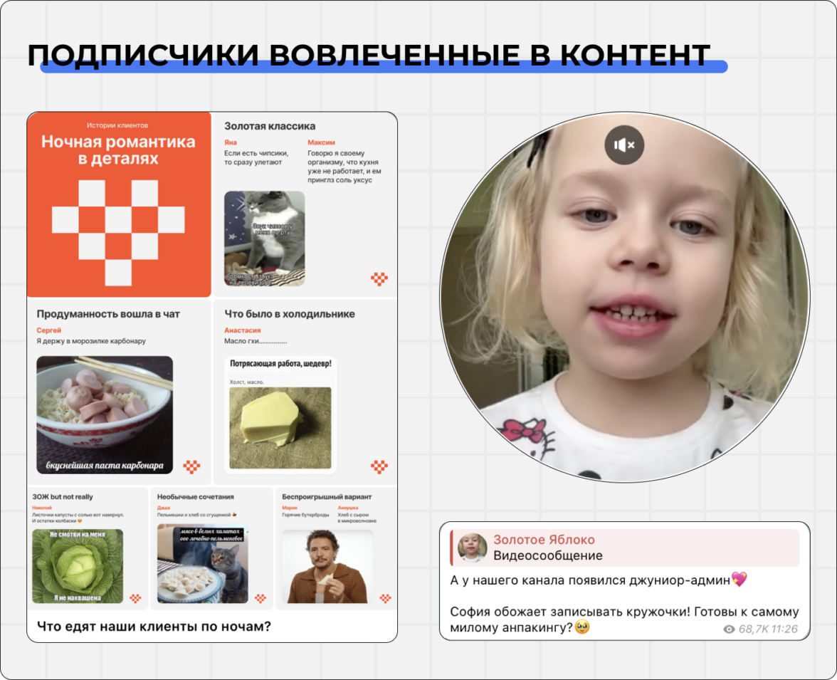 Достаточно заметный UGC-тренд: создание различных историй и обзоров от подписчиков. Это могут быть и придуманные авторами истории, как например, «Ночные истории о еде от клиентов» Кухни на районе, так и более реалистичные — с обзорами от подписчиков на примере Золотого Яблока.