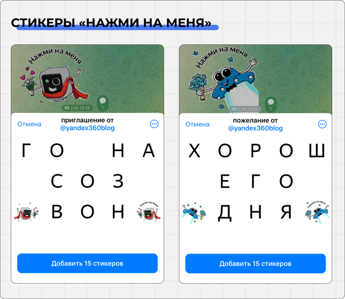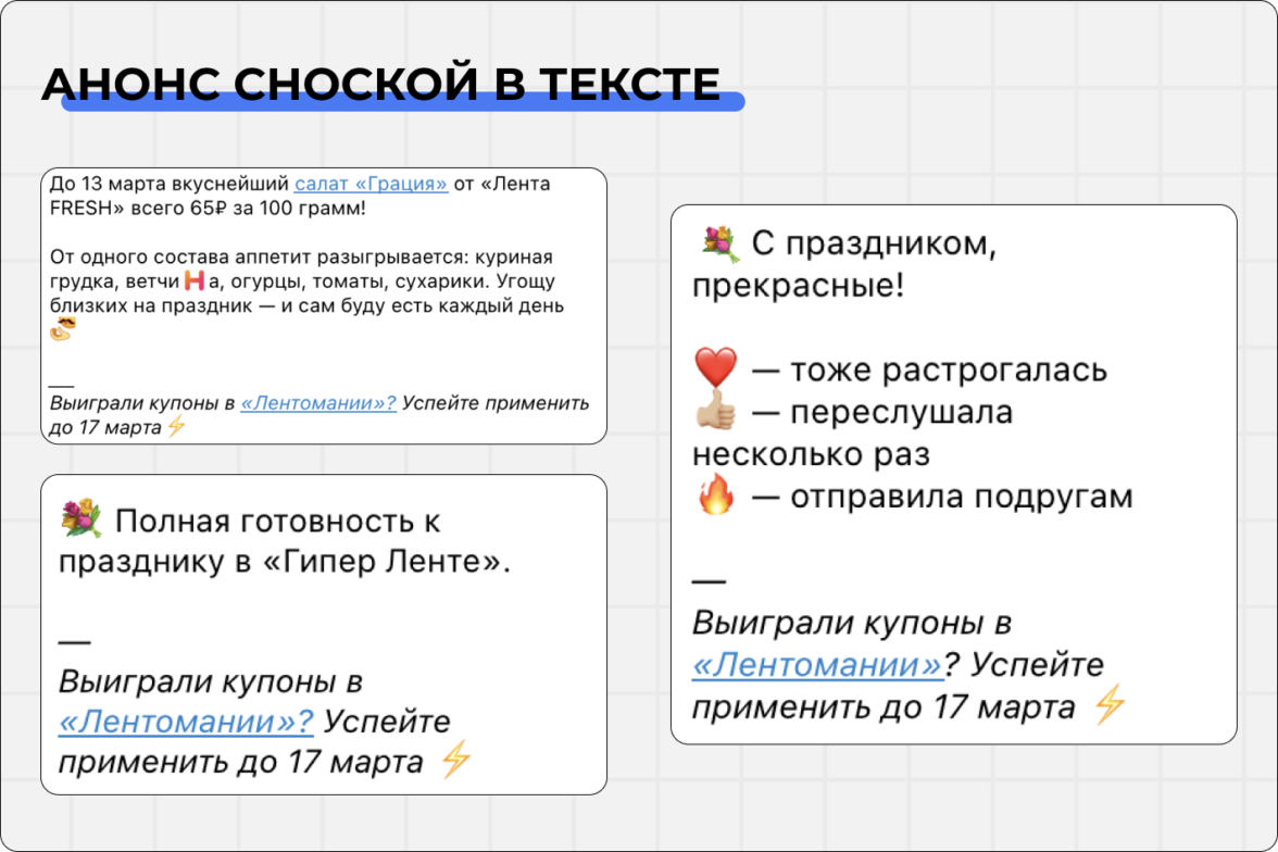 Если нужно что-то подсветить или просто поднять эмоциональный фон в канале, можно использовать отрисованный стикер по смыслу промо. А когда на него нажимаешь появляется короткий копи с акцией или продуктом, или просто с чем-то отвелечённым.