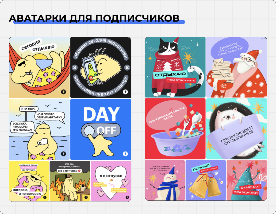 Аватарки для подписчиков — это часть заботы и возможность повысить узнаваемость бренда. Подобные форматы актуальны перед майскими, в начале лета и к Новому году, в те периоды, когда люди не хотят, чтобы их тревожили в рабочих чатах.