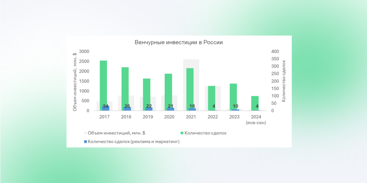 Для инвесторов наиболее востребованной технологией, как и в 2023 году, остается ИИ и машинное обучение. Этот тренд наблюдается и в рекламной индустрии — по данным Venture Guide, две из четырех сделок, заключенных в 2024 году в категории «Маркетинг и реклама», связаны с ИИ: