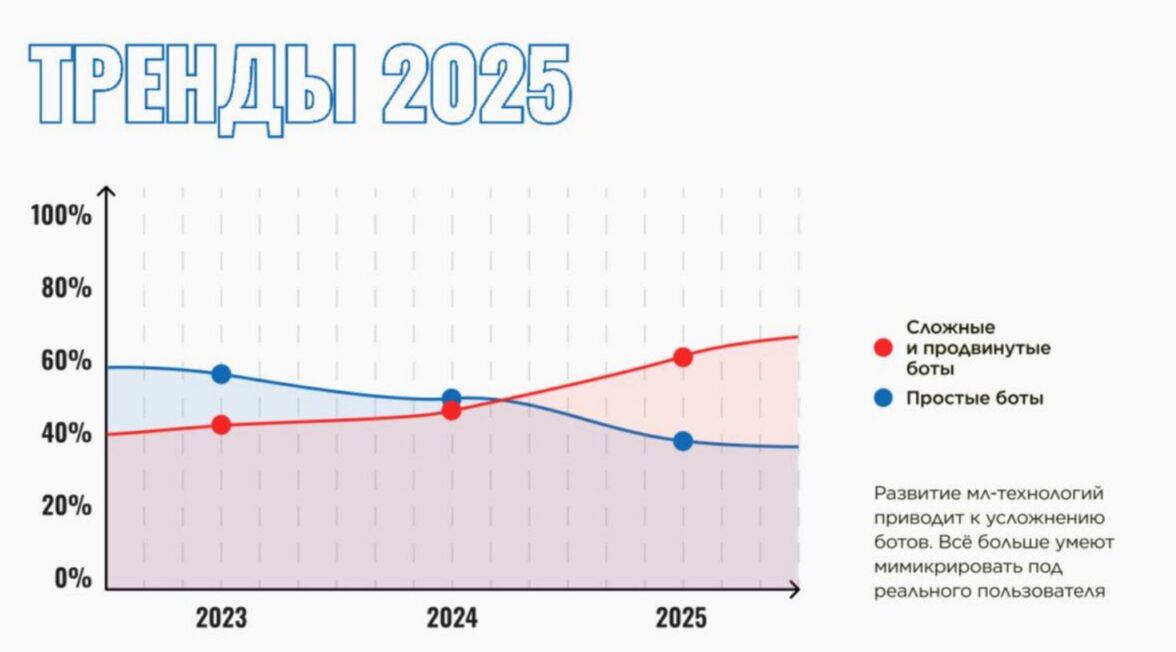 Боты эволюционируют. Например, за 2025 год специалисты «Ботфактор» заметили устойчивый рост атак умных и усовершенствованных ботов со спадом атак со стороны простых и примитивных фродовых профилей. Это повлекло за собой оптимизацию и совершенствование алгоритмов обнаружения сложного трафика.