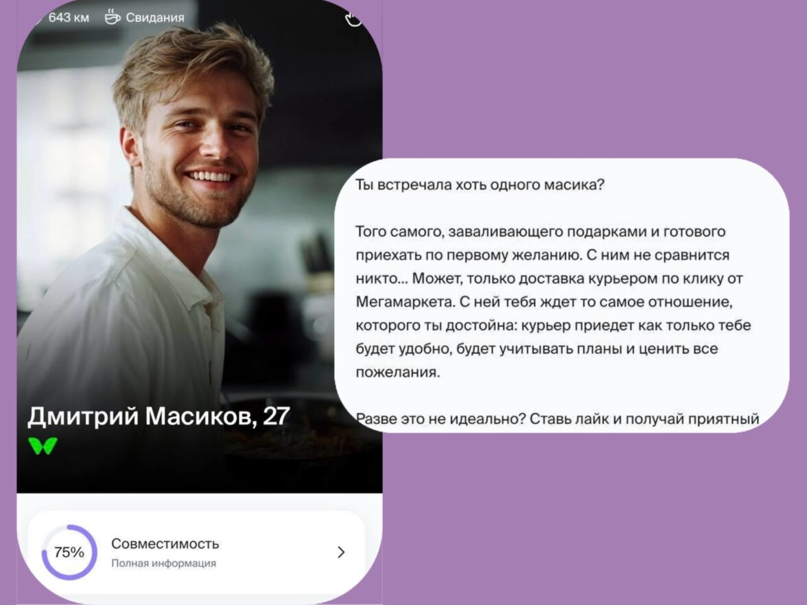 Для реализации проекта была выбрана активация с использованием дейтинг-приложения. Персонажи получили собственные профили на платформе знакомств. Алгоритмы анализировали данные о пользователях и предлагали им профили с высокой совместимостью. Такой подход помог привлечь потенциальных покупателей для Мегамаркета. Описание персонажей было написано так, чтобы они вызвали симпатию и интерес у пользователей, а аватары анкет были сгенерированы с помощью нейросетей.
