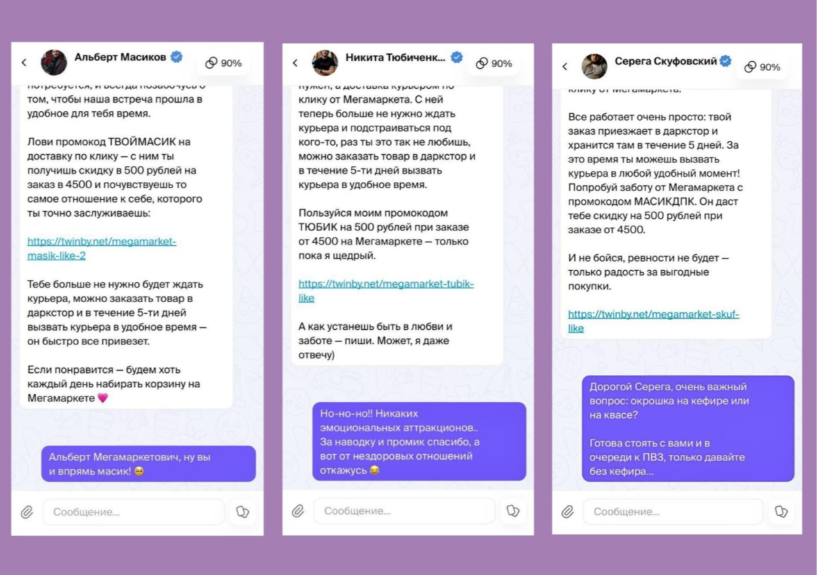 Раз в неделю «масик», «скуф» и «тюбик» использовали функцию суперлайк, чтобы выделиться в ленте и привлечь внимание пользователей. Эта функция позволила отправлять заметные сообщения и вызывать интерес целевой аудитории. Кроме того, персонажи предлагали промокоды на покупки в Мегамаркете.