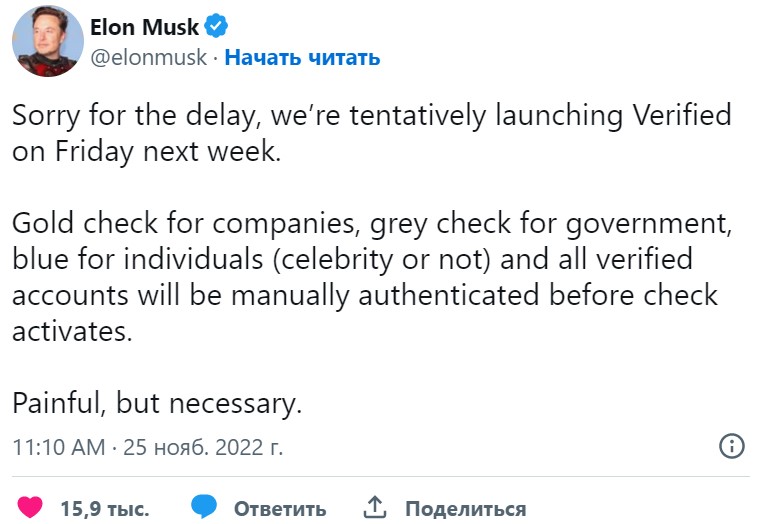 Изучив неудачный опыт нескольких дней монетизации, миллиардер сказал, что компания будет вручную аутентифицировать все «синенькие» аккаунты перед активацией галочки. Такой способ он назвал «болезненным, но необходимым».