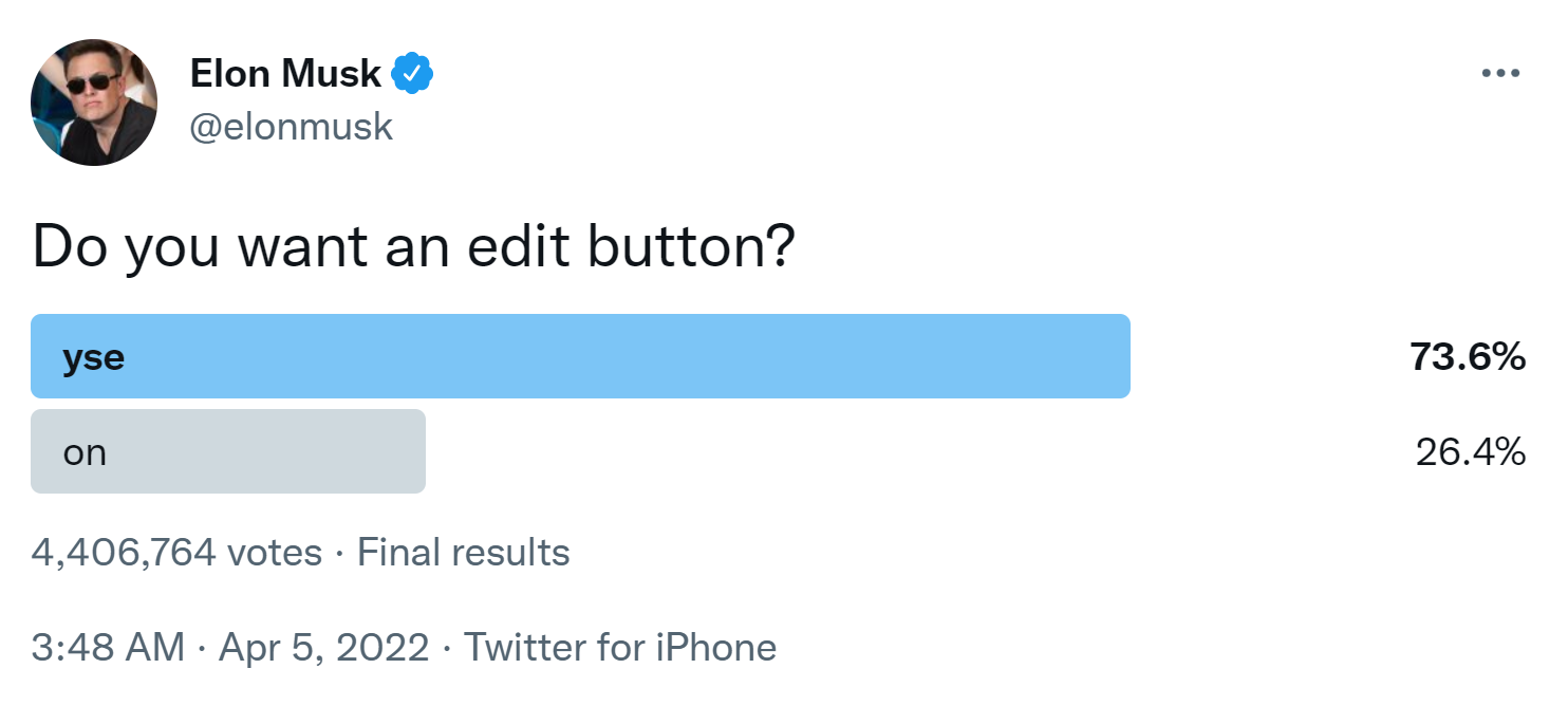 4 апреля крупнейшим акционером Twitter стал глава Tesla, основатель SpaceX Илон Маск, который получил 9,2% акций компании. Почти сразу же после объявления Маск, известный своею страстью к опросам в соцсети, провел еще один: о том, нужна ли кнопка редактирования твитов. В нем приняли участие 4,4 миллиона пользователей, 73,6% из которых выступили в пользу кнопки. Опрос ретвитнул новый генеральный директор Twitter Параг Агравал, который сказал, что его результаты «будут важны». Была ли это еще одна шутка?