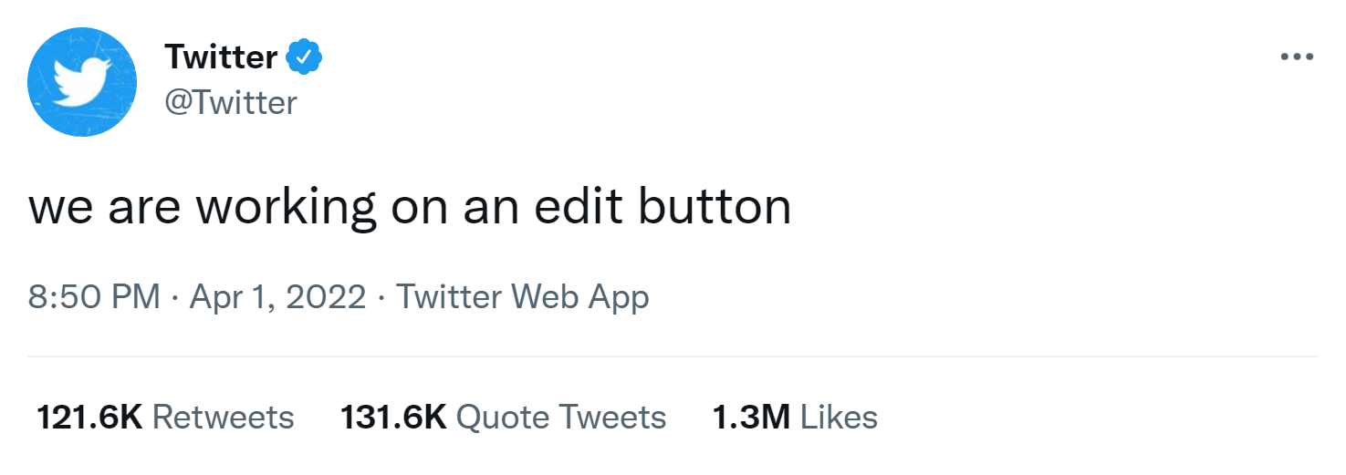 1 апреля в официальном аккаунте Twitter появился твит о том, что компания работает над функцией редактирования постов. Мир воспринял его как шутку, СМИ включили в свою подборку розыгрышей. Однако небрежный твит оказался частью продуманной PR-стратегии соцсети.