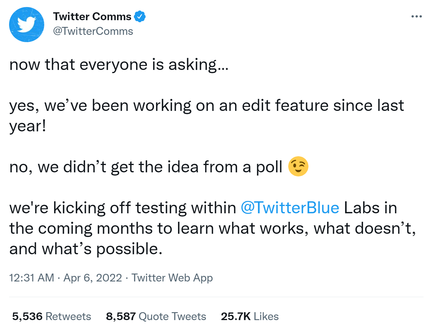На этот раз все серьезно. На следующий день, 6 апреля, аккаунт Twitter Comms официально сообщил, что в ближайшие месяцы сеть начнет тестирование функции редактирования.