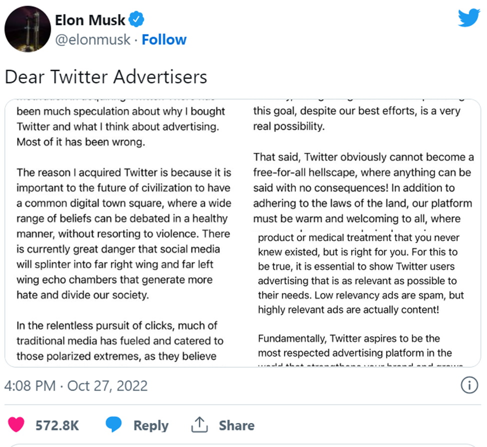Помимо новости о том, что сотрудники не потеряют работу, новый глава соцсети обнадежил рекламодателей, заявив, что рассчитывает сделать соцсеть «самой уважаемой рекламной платформой, которая укрепит бренд и разовьёт предприятие». Он хочет, чтобы Twitter был «общей цифровой городской площадкой, где можно обсуждать широкий спектр убеждений в здоровой манере, не прибегая к насилию».
