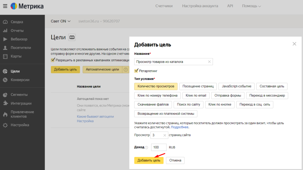 Создаем счетчик и настраиваем целевые действия