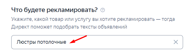 1. Указываем товар, который будем рекламировать. На основании этой информации умный алгоритм будет подбирать текст объявлений.