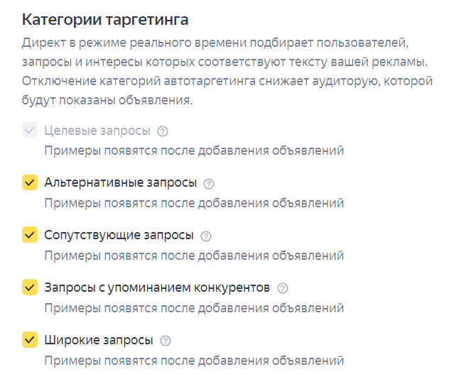 Выбор категории таргетинга. По умолчанию таргетинг настроен на все виды запросов, за исключением целевых. Они станут доступны после добавления объявлений. При необходимости можно отключить какой-то вид таргетинга. Например, таргетинг на запросы с упоминанием конкурентов.