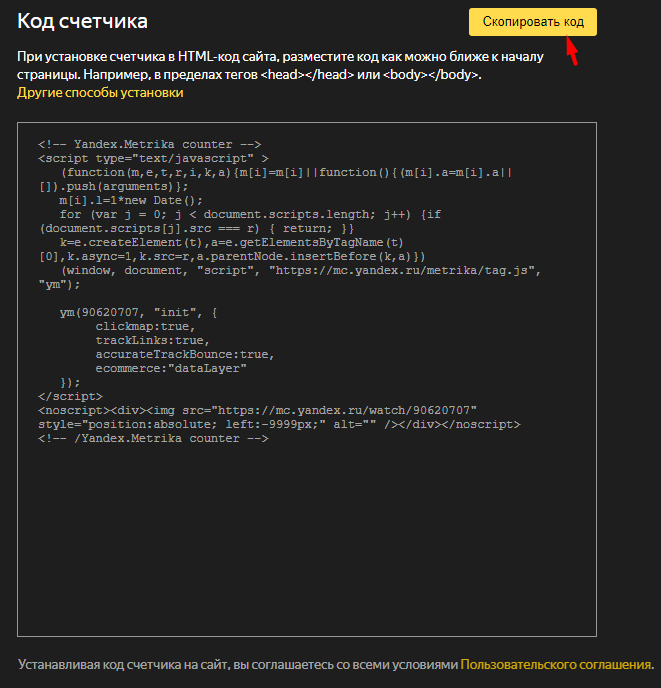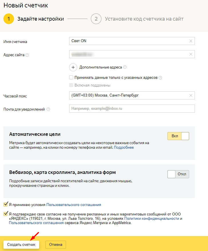 После этого приступаем к созданию счетчика в Яндекс.Метрике: