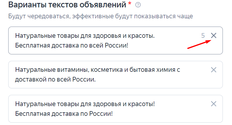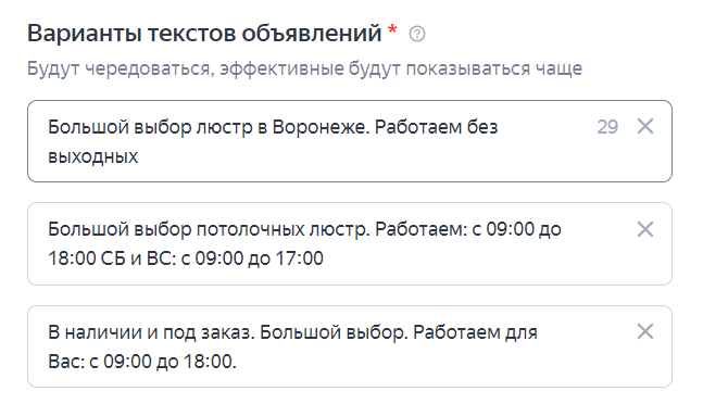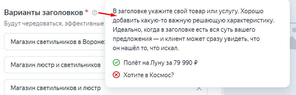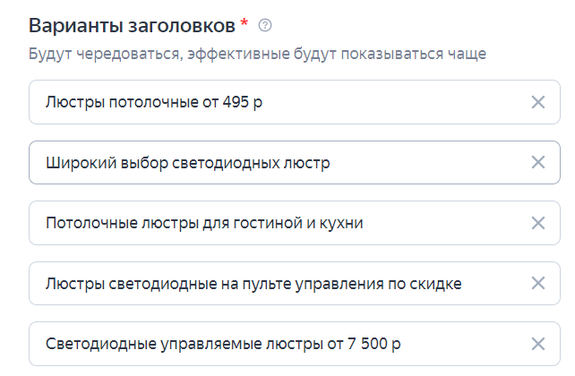 2. Редактируем варианты заголовков. Всего в объявление можно добавить до 5 заголовков, длина каждого — не более 56 символов.