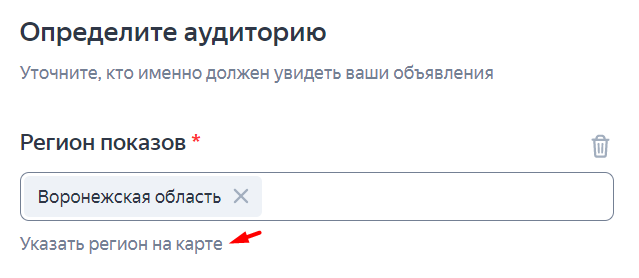 1. Определяем регион показов. Выбираем из списка города и области, в которых находится наша целевая аудитория.