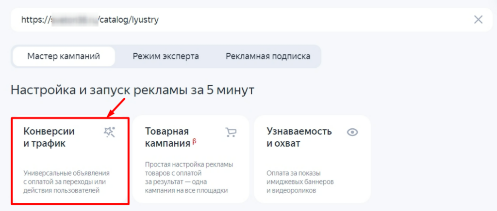 Интернет-магазин хочет увеличить количество покупок люстр. Поэтому выбираем цель — «Конверсии и трафик».