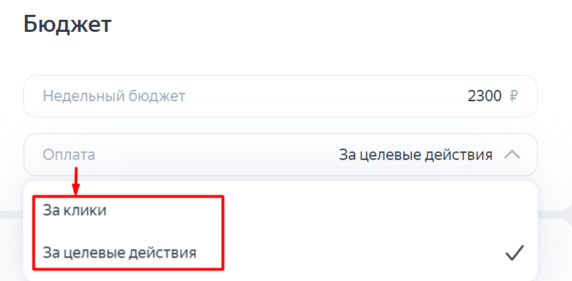 • Выбираем способ оплаты. Выше мы задали цели с учетом воронки продаж, поэтому устанавливаем оплату за целевые действия.