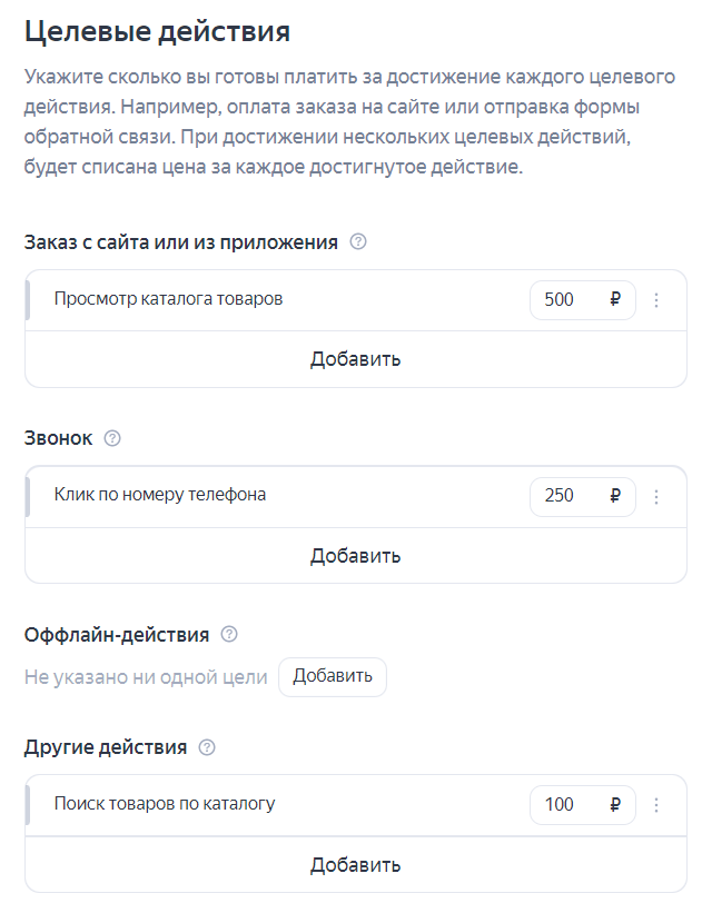 Добавляем целевые действия, настроенные в Метрике. Присваиваем им ценность: