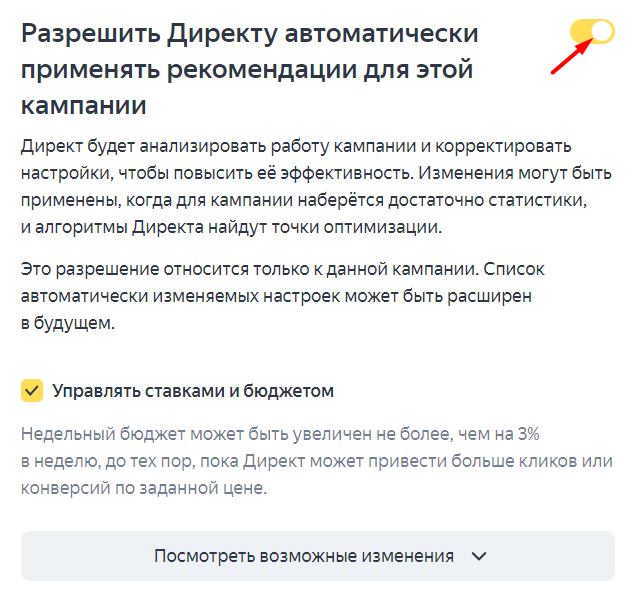 Последний шаг в настройке кампании — разрешаем Директу автоматически применять рекомендации для запущенной кампании. В этом случае система может расширять и изменять аудиторию таргетинга, географический таргетинг, пол и возраст аудитории, увеличивать недельный бюджет (не более чем на 30% от его размера), добавлять автоцели.