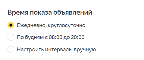 2. Задаем время показа объявления. В настройках можно указать конкретные дни и часы, когда объявления будут показываться пользователям. Но мы не будем ограничивать временной таргетинг, чтобы не упустить целевую аудиторию.