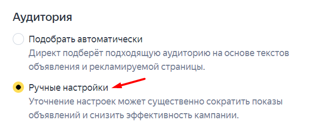 5. Определитесь с настройками аудитории. Если вы хотите иметь больше инструментов для нацеливания на свою ЦА, отдавайте предпочтение ручным настройкам. Но в этом случае помните, что слишком точные настройки снижают рекламный охват и можно получить маленькое количество показов.