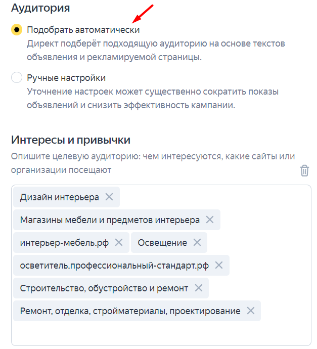 Для увеличения точности автоматического таргетинга указываем интересы и привычки аудитории. Например, в случае с интернет-магазином люстр и осветительных приборов пользователи могут интересоваться дизайном интерьеров, ремонтом в квартире, сайтами, на которых продаются мебель и осветительные приборы.