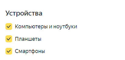 Таргетинг на устройства. Можно таргетироваться на пользователей компьютеров и ноутбуков, планшетов и смартфонов. Мы не будем ограничивать этот вид таргетинга для магазина осветительных приборов.