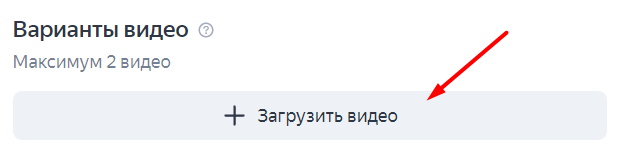 5. Добавляем видео. В рекламную кампанию можно загрузить до двух видеороликов длительностью 5–60 секунд. Допустимые форматы: MP4, WebM, MOV, QT, FLV, AVI. Ограничение — видео должно быть размером не более 100 Мб.