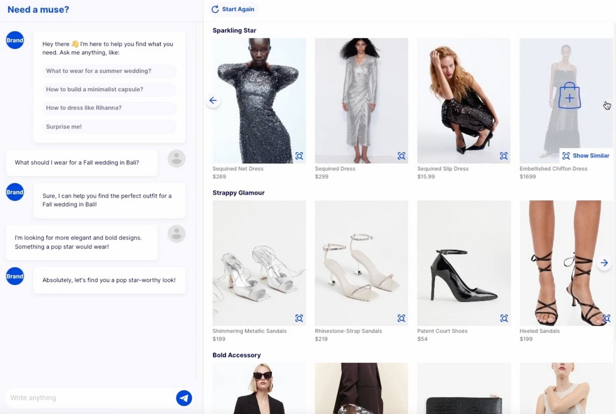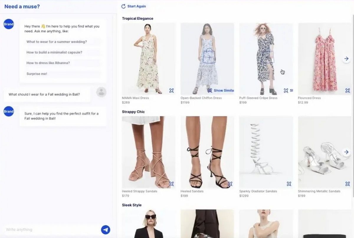 Shopping Muse понимает разговорный язык и может давать индивидуальные рекомендации по подбору одежды, дополняя их соответствующими аксессуарами и обувью.