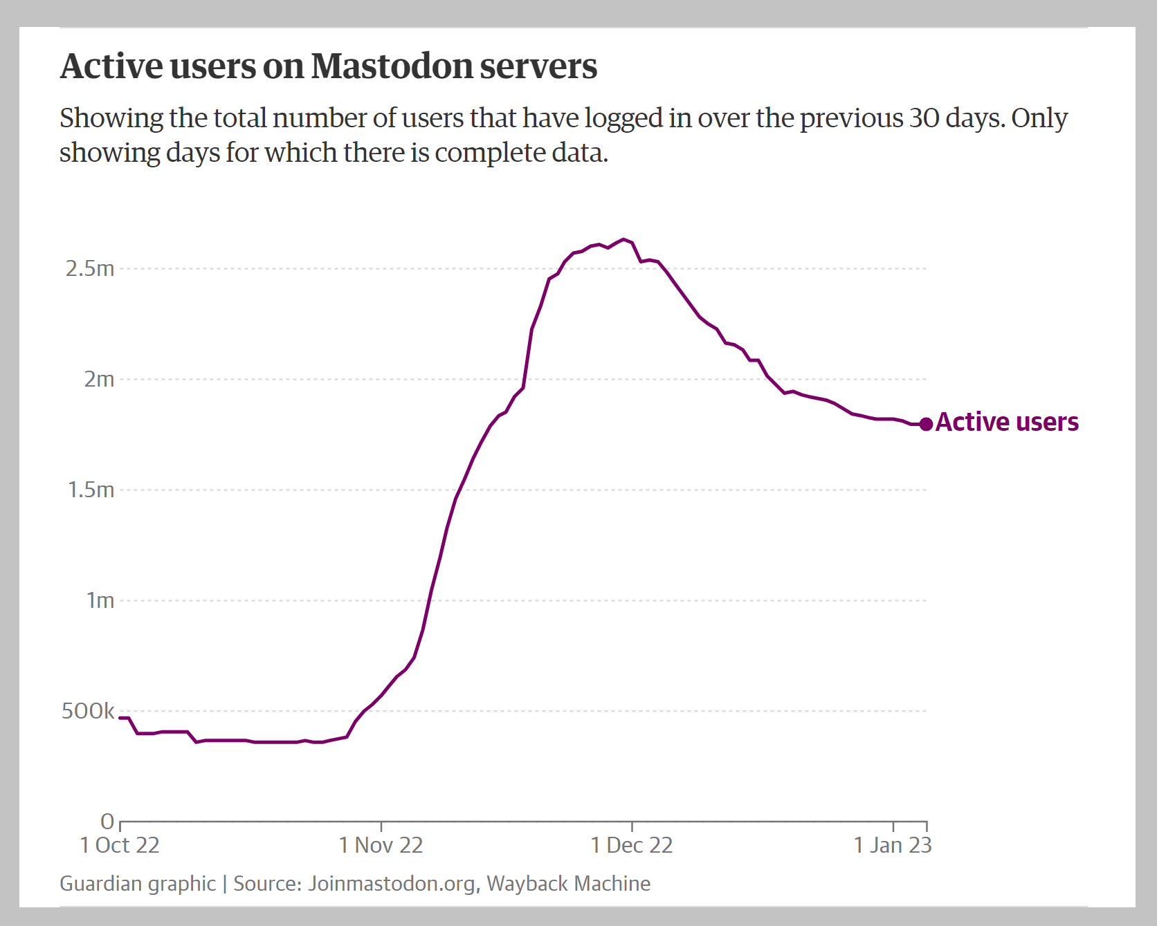 В первую неделю января 2023 года количество активных пользователей соцсети составляло около 1,8 млн человек, а в начале декабря прошлого года в Mastodon активно присутствовало примерно 2,5 млн человек.