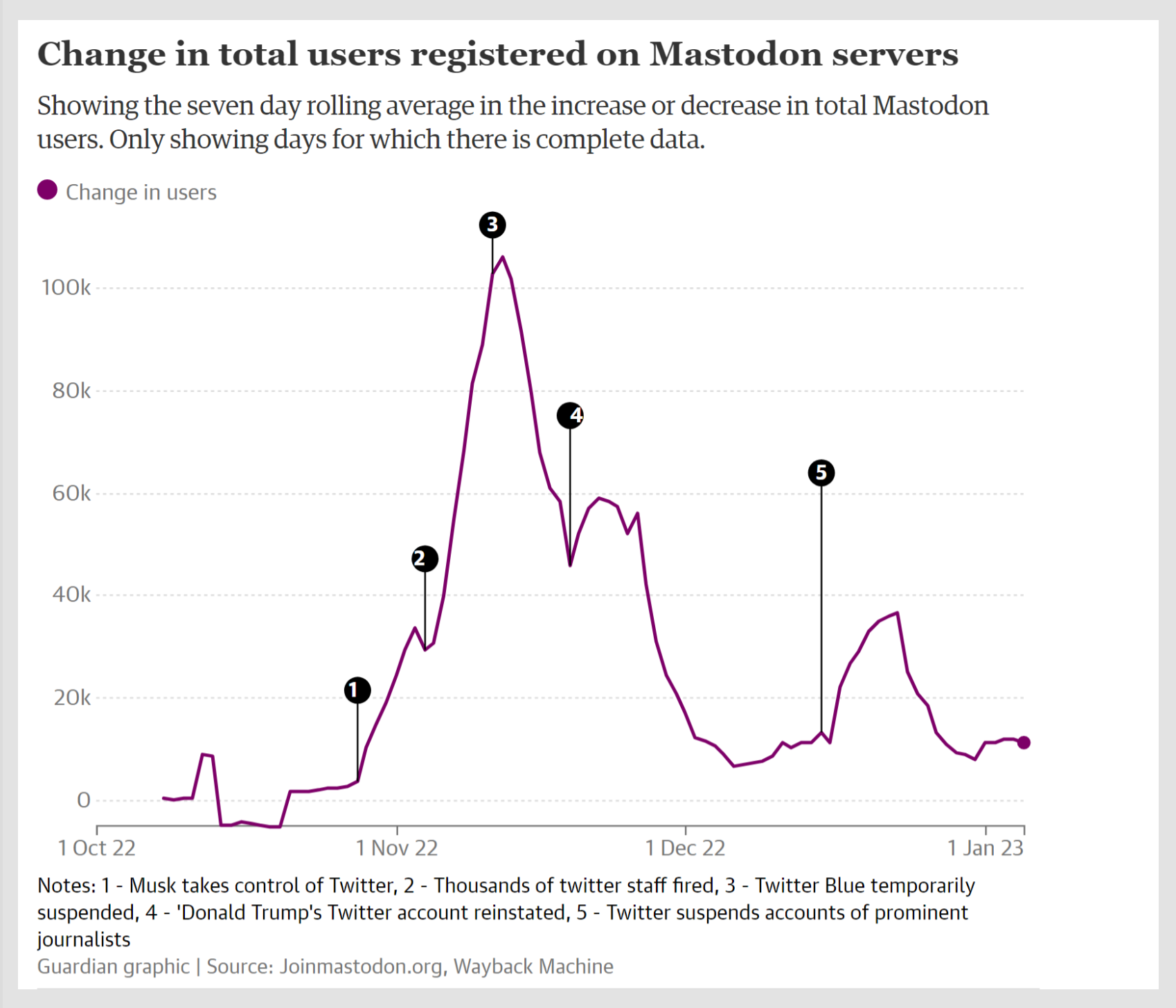 Стараниями Илона Маска соцсеть Mastodon набрала более миллиона новых пользователей. Но успех децентрализованной альтернативы Twitter был очень недолгим. Согласно недавней статистике, после взрывного роста в конце прошлого года количество активных пользователей Mastodon упало почти на 30%.