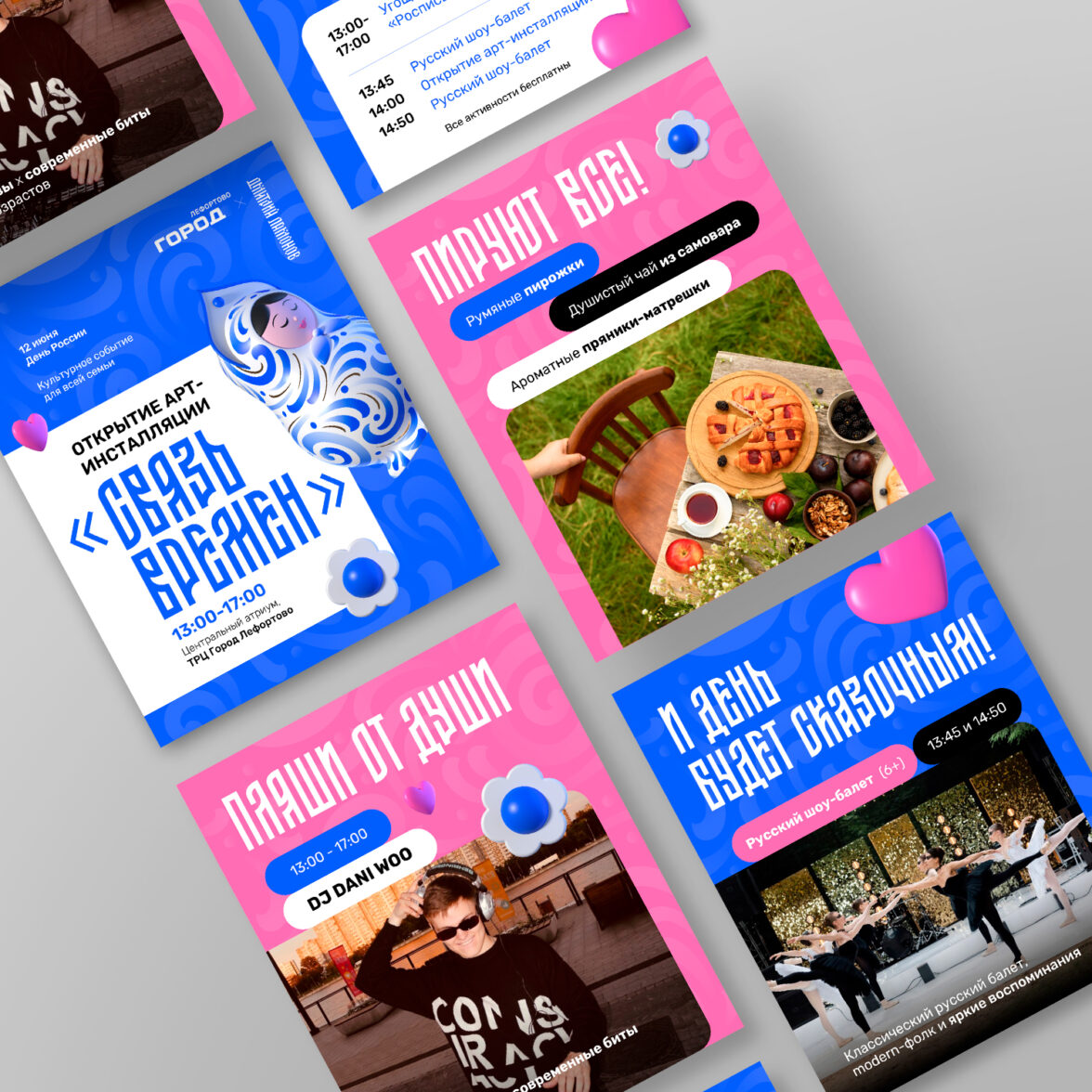 Идея была реализована в формате арт-инсталляции от известного художника Дмитрия Ламонова. Концепция «Связь времен» воплотилась в установке трех трехметровых матрешек, символизирующих русский культурный код в разные эпохи. «Василиса», выполненная в традиционной манере, транслировала уют и семейные ценности; «Ольга», созданная в стиле авангардного супрематизма, напоминала о свободе и революционных идеях; «Зоя» отражала современность и цифровое время.
