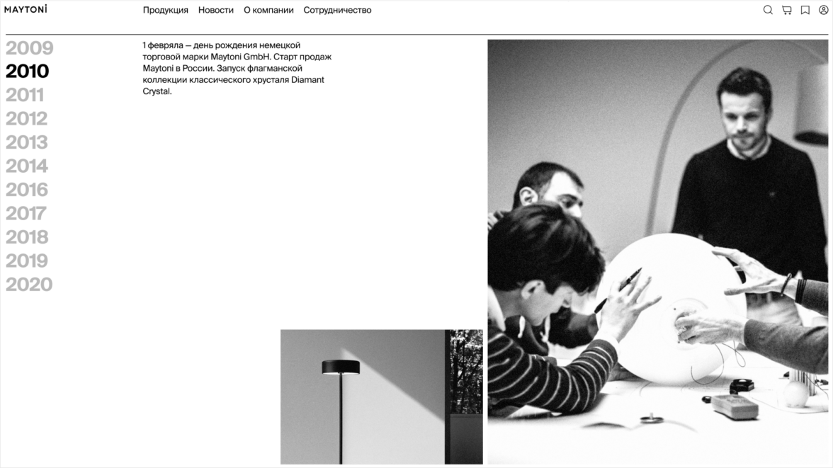 Главная страница занимает всего один экран и сразу акцентирует внимание на этих трех направлениях. Каждое из них представлено своим визуальным образом, который обновляется с появлением новых коллекций.