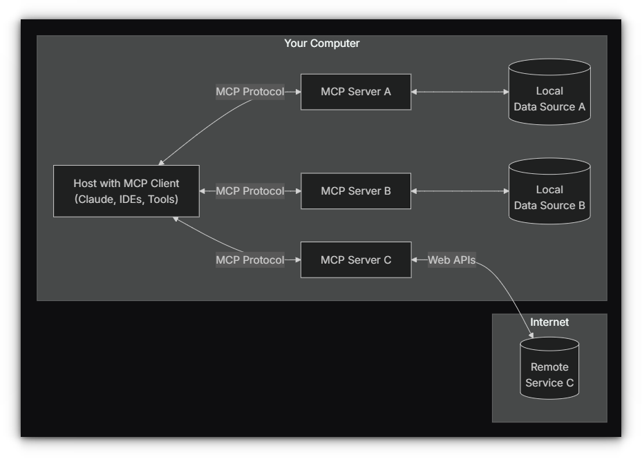 Для удобства интеграции MCP-серверы построены на стандартной клиент-серверной архитектуре. Она включает в себя три компонента: