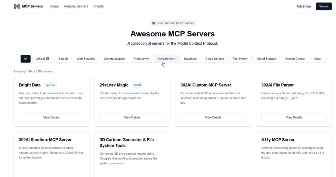Создать MCP-сервер может любой разработчик. Есть и список серверов MCP с открытым исходным кодом, которые можно клонировать и протестировать с помощью любого ИИ. На скриншоте — пример такого списка (источник: mcpservers.org).