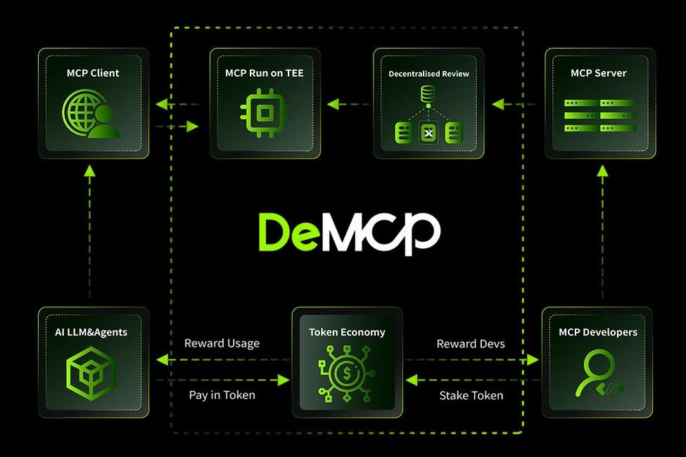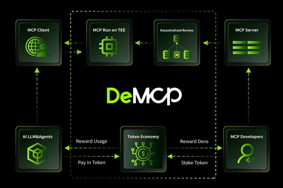 На скриншоте — пример использования МСР в криптопроектах. DeMCP предоставляет доступ к GPT-4 и Claude через MCP-инстансы по запросу (источник: demcp.ai).