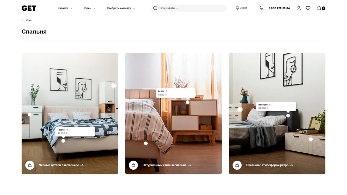 Сегодняшние клиенты ищут вдохновение, просматривая сайты и приложения, такие как Pinterest и Telegram, чтобы собрать со вкусом подобранные примеры дизайна интерьера. Мы предложили использовать курируемый контент, интерьеры с продуктами, которые можно приобрести на get.ru, организовав возможность покупки по изображению. Сама по себе идея не нова, но особенностью ее реализации стал приоритет на фото и видео контенте, по сравнению с текстовым. Вместе с тем, раздел «Идеи», снабжен возможностью организации структуры Cluster-Pillar, когда одна публикация объединяет одну из больших тем ссылаясь на набор отдельных идей интерьера, раскрывающих тему в деталях.