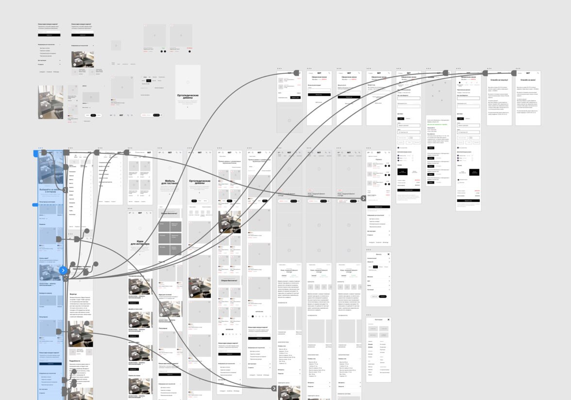 Вместе с командой GET.ru мы определили целевые аудитории и 14 наиболее часто встречающихся путей пользователя в мебельном интернет-магазине. Мы выделили приоритетные пути, которые лучше всего отражают мотивацию, потребности и болевые точки клиентов. Наша цель состояла в том, чтобы улучшить поведенческие факторы за счет оптимального интерфейса и релевантного контента, который адаптируется к потребностям покупателя.